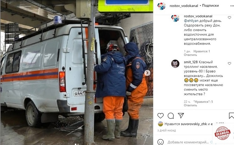 Очевидно губернатор имел ввиду пост, появившийся на днях в Instagram предприятия. На вопрос людей о том, как решить вопрос с рыбной вонью от водопроводной воды, там ответили: «Оздоровить реку Дон, либо сменить водоисточник для централизованного водоснабжения». Там также добавили, что цветение Дона в феврале наблюдается впервые. Место жительства, справедливости ради, никто никому менять не советовал.