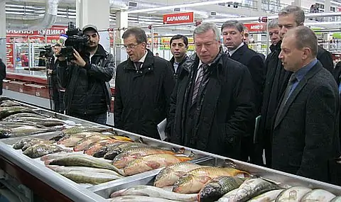 Мэр Ростова Михаил Чернышёв, кстати, приехал раньше и скромно ждал возле входа в торговый павильон. Наконец губернаторский кортеж подкатил к рынку, и делегация направилась по торговым рядам.