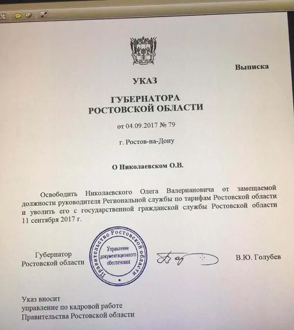 В качестве доказательства Хуруджи выложил текст указа за подписью губернатора Голубева от 4 сентября, в котором говорится, что Николаевский 11 сентября будет уволен с госслужбы. Имя его преемника пока неизвестно.