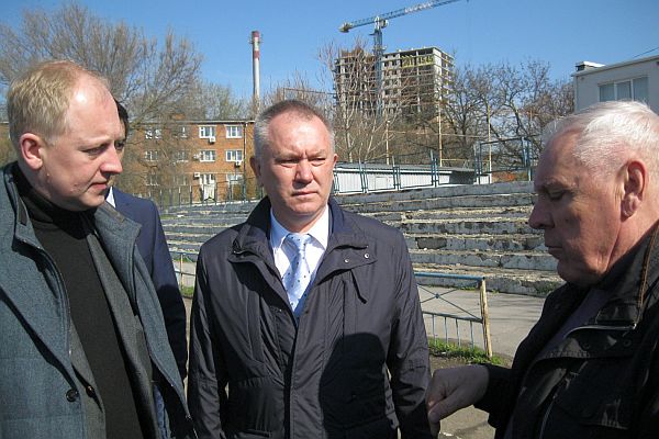 Директор стадиона «Локомотив» рассказывает Сергею Амбарнову (крайний слева), что предстоит сделать на стадионе