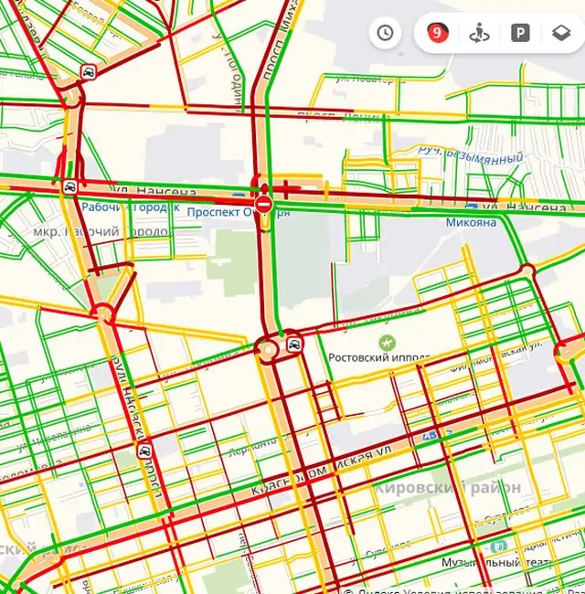 Ледяной дождь, который идёт в Ростове с раннего утра вторника, 20 ноября, ожидаемо стал причиной пробок. Сервис «Яндекс.Пробки», по данным на 10:00, оценивает загруженность большинства ростовских улиц в 9 баллов.