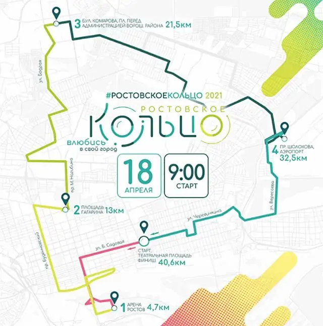 «Ростовское кольцо» состоит из пяти этапов, в соответствии с их проведением и будет перекрываться движение транспорта. После каждого этапа легкоатлетов ожидает остановка на 20-30 минут. Предполагается, что спортсмены будут двигаться со средней скоростью 10 километров в час.