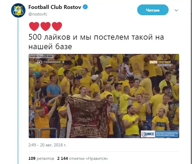 Необычно празднующий голы жёлто-синих болельщик сразу попал в объектив телекамер. «Ростов» не упустил возможность словить хайп и объявил в твиттере, что постелет ковёр на базе, если твит наберёт 500 лайков.