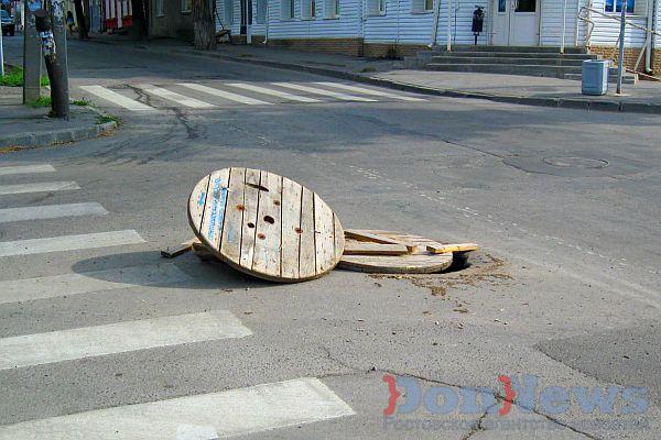 В нескольких сотнях метров от этой ямы, уже несколько недель «скучает» ещё одна. Там для начала вставили ветку дерева, потом кто-то прикатил две бобины от кабеля.
