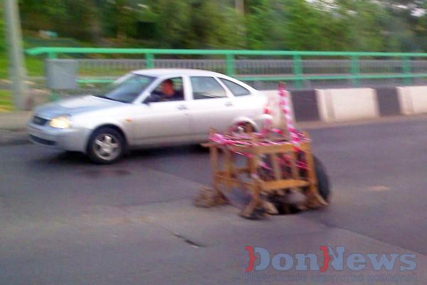 Очередная яма, появилась в Ленинском районе Ростова. В переулке Доломановском на проезжей части уже несколько дней водителям приходится объезжать дорожный «провал». Для безопасности яму забросали мусором и воткнули огромную палку — авось увидят.