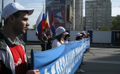 Тем временем колонна приготовилась двинуться в путь. Цель — площадка перед Домом профсоюзов, на пересечении Ворошиловского и Красноармейской, там пройдет митинг.