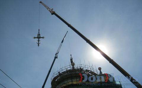 После вступительной речи губернатора Василия Голубева и молитвы главы донской митрополии начался монтаж надглавного креста для основного купола собора.