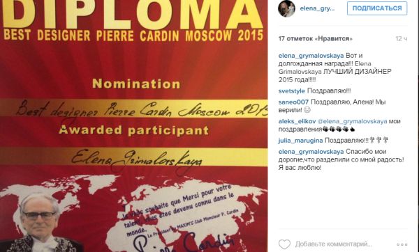 Ростовчанка Елена Грималовская победила в конкурсе Best Designer Pierre Cardin Moscow – 2015 в номинации «Лучший дизайнер 2015 года». Об этом она поведала подписчикам в соцсетях.