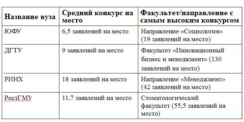 Средний конкурс в ЮФУ составил 6,5 заявления на место. Выделилось направление «Социология», на которое было подано по 19 заявлений на место. Как отметили в пресс-службе вуза, на факультеты с самым низким конкурсом было подано не менее 3 заявлений на место. Проходной балл варьировался от направления к направлению: например, на зарубежную филологию минимальный проходной балл составил 247, на отечественную — 212, на архитектуру — 280, по фундаментальной информатике и информационным технологиям — 232.