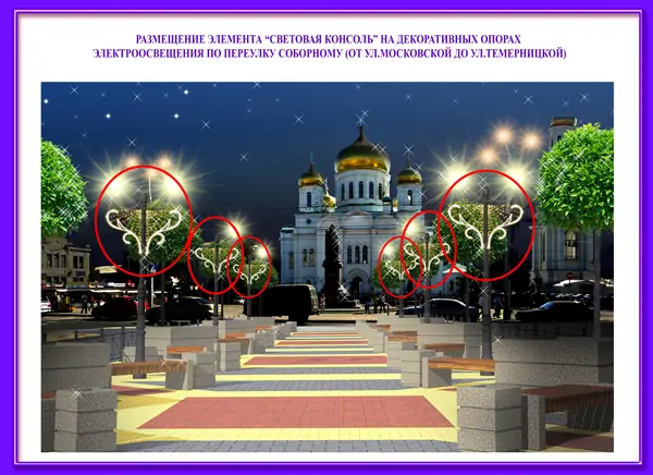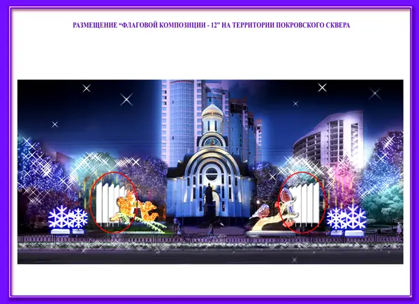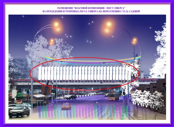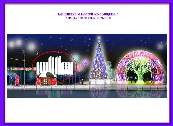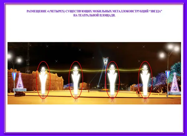 Как сообщается в тексте технического задания, «установка отдельно стоящих металло-флажных конструкций, объёмно-пространственных композиций, вертикальных, горизонтальных растяжек, подвесов и флажных композиций на опорах электротранспорта, панно на фасадах зданий, сооружений, существующих и изготавливаемых отдельно стоящих световых элементов и световых элементов на зданиях, сооружениях и опорах электроосвещения красочных световых отдельно-стоящих объёмно-пространственных композиций украсит город, создаст праздничное настроение и обеспечит положительное эмоциональное восприятие их людьми в светлое и тёмное время сутол».