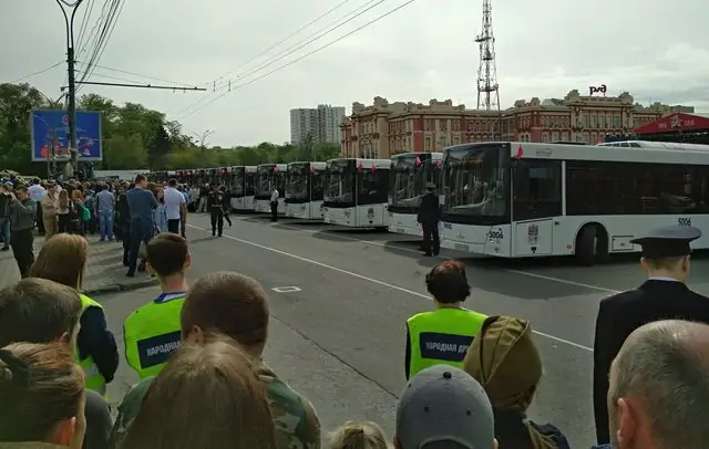 К 9 часам на площадь привезли 10 автобусов с ветеранами войны, тружениками тыла и вдовами участников и инвалидов Великой Отечественной войны, для которых были приготовлены специальные трибуны с креслами.