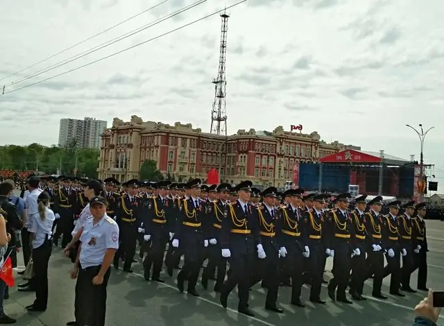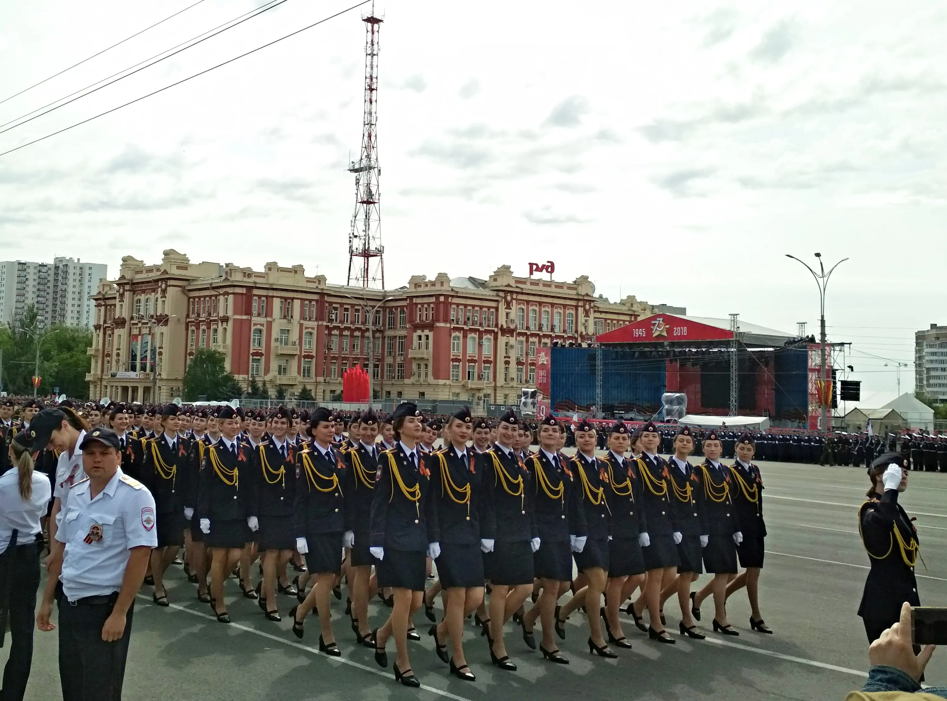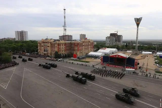 Открывал парад Победы командующий войсками Южного военного округа генерал-полковник Александр Дворников. А затем под торжественную музыку по Театральной площади прошли расчёты различных формирований войск ЮВО, ростовские курсанты, кадеты и юнармейцы.