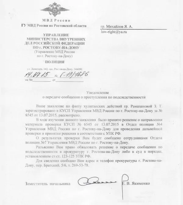 «В отношении гражданки Рамазановой З. Т. УМВД Ростовской области проводит доследственную проверку: материалы переданы по подследственности в ОП-4 г. Ростов-на-Дону. Напомню, 20 октября 2013 года гр. Рамазанова З. Т. во время концерта во Дворце спорта совершила хулиганские действия. На концерте присутствовали дети. Интересен тот факт, что полиция данный факт проигнорировала и не пресекла действия Рамазановой», — написал в соцсети адвокат заявителя Ярослав Михайлов и подтвердил свои слова фотографией заявления в полицию.