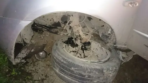 О силе удара можно судить по тому, что у машины вырвало колесо.
