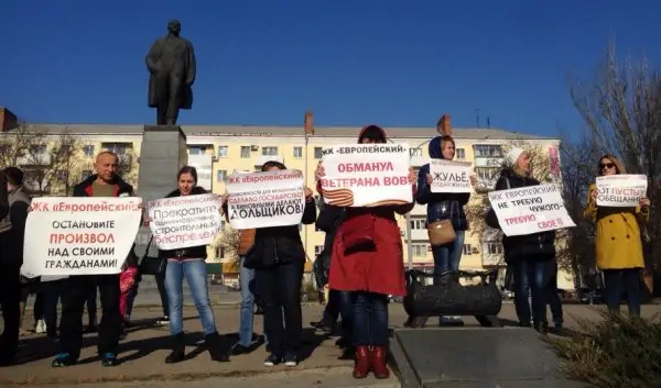 Несколько десятков ростовчан вышли на площадь Ленина с лозунгами «Жульё, отдайте жильё» и «Сегодня митинг — завтра голодовка!». Плакаты держали в руках обманутые дольщики жилищного комплекса «Европейский».