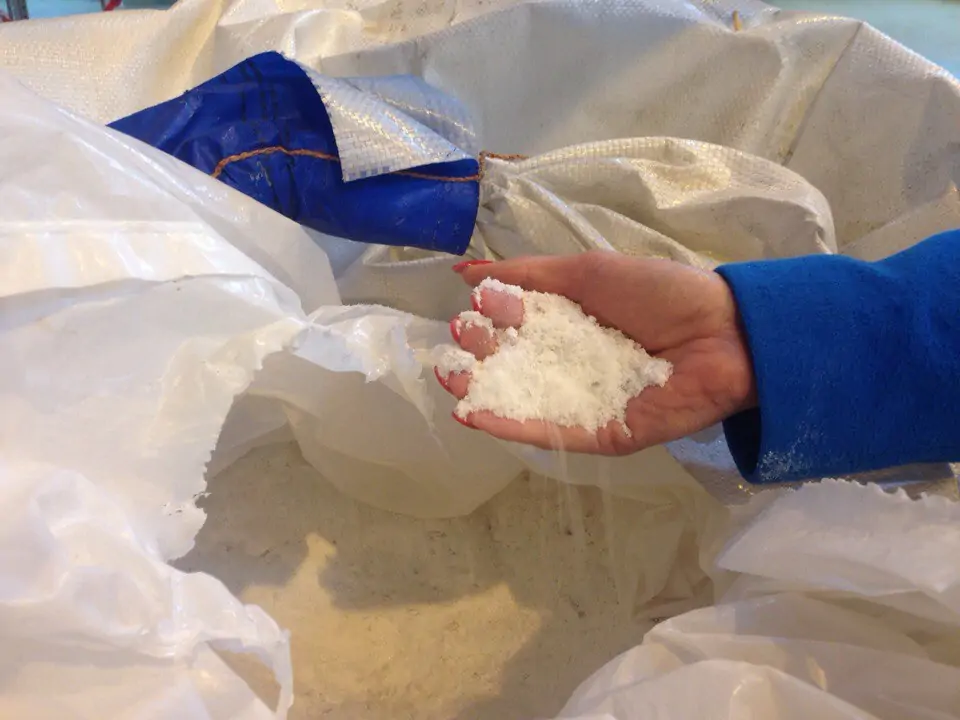 Для производства реагента используется только поваренная соль, вода и электричество. Соль привозится, загружается в солерастворители. Внизу ёмкостей засыпан дренажный слой — вода подаётся сверху и, проходя через соль, насыщается, получается крепкий солевой раствор.