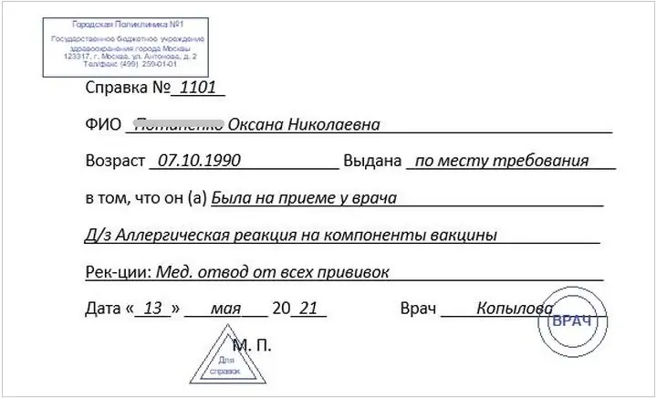 Справка о медицинском отводе от прививок может выглядеть следующим образом