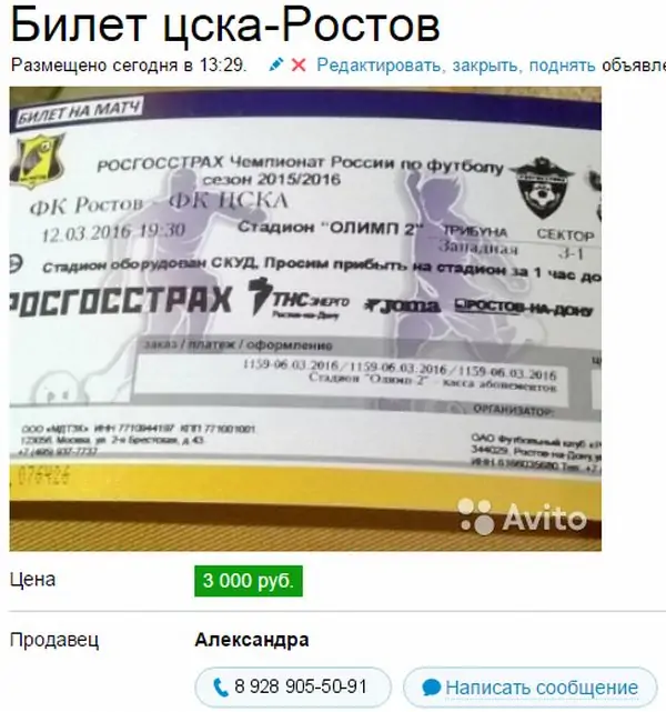 «Максимально близко к центру (не края), центральный ряд под крышей (отличный обзор и сухо в случае дождя)! Цена указана за один билет. В кассах ни единого билета на игру не осталось! Торг за такие места на такой матч неуместен», — прорекламировал билет один из перекупщиков, предложив купить его за 1500 рублей. К слову сказать, в кассе билет на это место стоил бы не дороже 700 рублей.