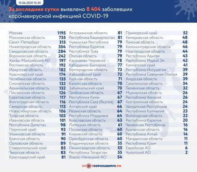 В России число заразившихся достигло 493 657 человек. За сутки эта цифра выросла сразу на 8404. За последние 24 часа в России скончался 216 пациентов. Всего по стране с начала эпидемии зафиксированы 6358 смертельных исхода.