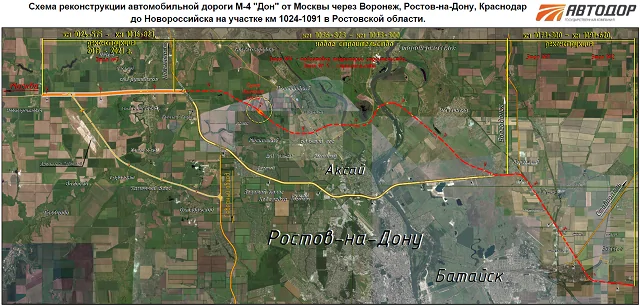 Напомним, что проект предполагает реконструкцию трассы М4 «Дон» на участках с 1024-го по 1036-й километр и с 1072-го по 1091-й километр, а также строительство новой дороги — дублёра М4 «Дон» — в обход Аксая с 1036-го по 1072-й километр. Заказчиком объекта является госкомпания «Автодор». Общая протяжённость новой дороги составляет 65 км, участка-дублёра — 35,5 км.