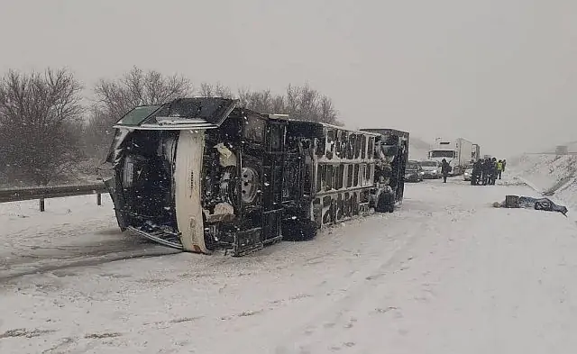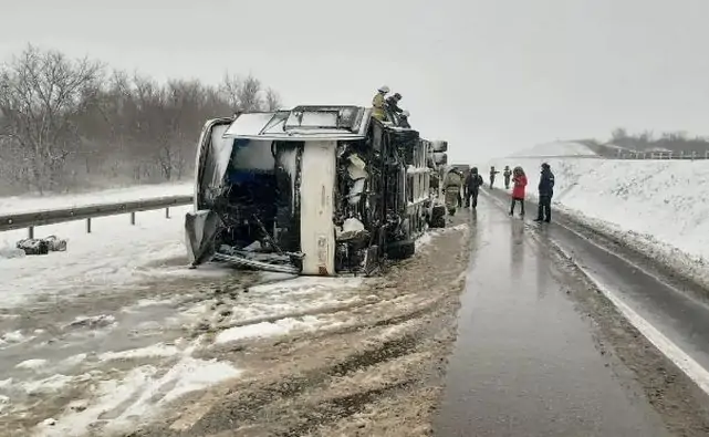 По информации ТАСС, 59-летний водитель не смог справиться с управлением на заснеженной трассе, и автобус съехал в кювет, где перевернулся.