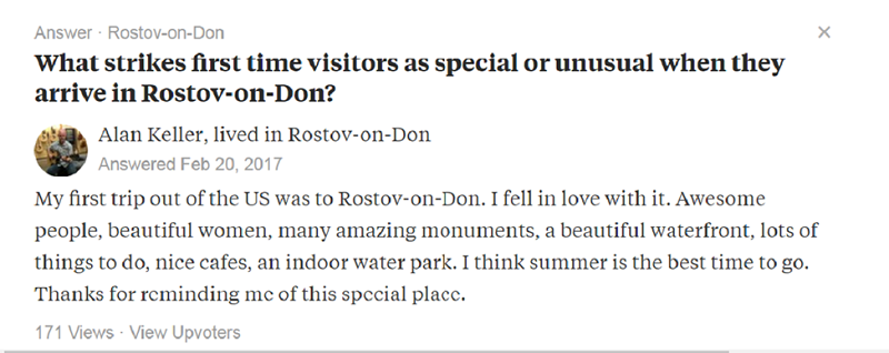 Летом в Ростове пройдут пять матчей чемпионата мира по футболу. Поддержать команды приедут болельщики как минимум из восьми стран-участниц. Город готовится к приёму гостей, а туристы — к путешествию: бронируют отели, изучают информацию о месте. Donnews.ru почитал информацию на английском, чтобы выяснить, что о городе узнает иностранец из блогов и форумов.