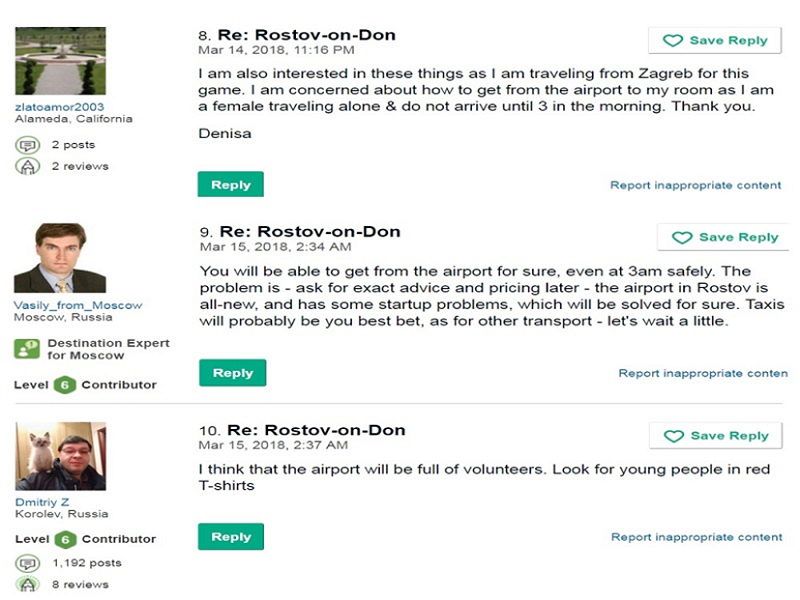 Москвич под ником Andres16 уверен, что аэропорт расположен возле города, а цены на такси не превышают 500 рублей. Ещё один житель столицы Василий советует задать вопрос позже, когда решится проблема с общественным транспортом. Дмитрий из Королёва предлагает искать в аэропорту людей в красных футболках — волонтёров.