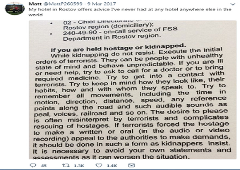 Встречаются в ростовских гостиницах и свои странности. Англичанин Мэт увидел в ростовском отеле инструкцию под названием «Если тебя удерживают в заложниках или похитили». Её авторы советуют не сопротивляться, наладить с похитителями контакт, но при этом не стараться понравиться.