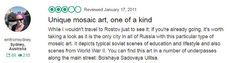 «Я бы не поехала в Ростов только ради этой мозаики, но во время прогулки стоит обратить на них внимание. Это единственный город во всей России, в котором можно увидеть этот особенный вид искусства мозаики. На них изображены типичные школьные или жизненные сцены, а также связанные со Второй мировой войной», — пишет туристка из Австралии.