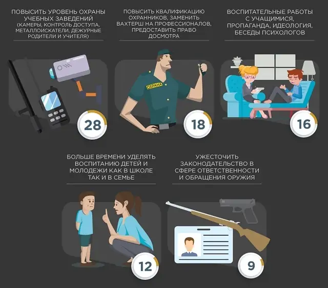 Ответы простых граждан отличаются от мнения экспертов. 28% опрошенных считают, что первоочередная задача — повысить уровень охраны учебных заведений (камеры, контроль доступа, металлоискатели, дежурные родители и учителя).
