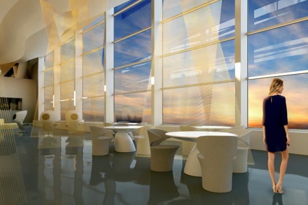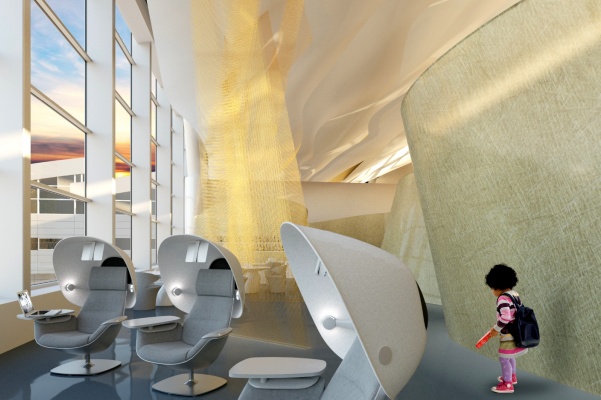 В свою очередь VOX Architects разработали концепцию для залов повышенной комфортности междунароных рейсов под названием «Солнце. Воздух. Берега». Так, на входе в зал ожидания предлагается установить арт-инсталяцию «Восход Солнца». По задумке архитекторов, сияющие перегородки — «лучи» небесного светила — «зададут планировочное решение, формируя просторные и камерные зоны для комфортабельного ожидания».