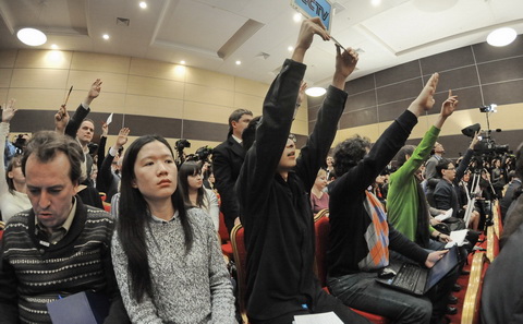 Из украинский СМИ в зале было несколько телеканалов, но им слово досталось лишь дважды.