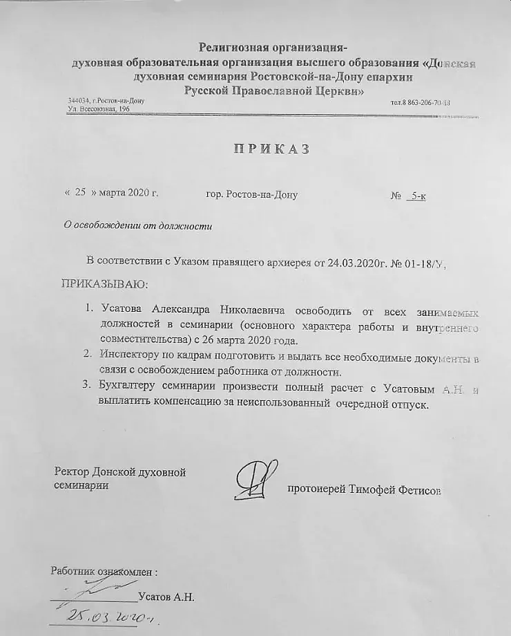 Далее в Ростовской епархии был оформлен указ о запрещении в служении Усатова на основании 25-го правила апостолов («Епископ, или пресвитер, или диакон, в блудодеянии, или в клятвопреступлении, или в татьбе обличённый, да будет извержен от священного чина, но да не будет отлучён от общения церковного»), а также «по болезни».