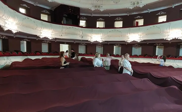 После туристам предложили отправиться на главную улицу Таганрога — Петровскую, где располагается известный театр имени Чехова. По словам гидов, это маленькая копия итальянского La Scala. Увлекательная экскурсия по театру знакомит с тайнами и историями. Построенный менее чем за год, таганрогский театр появился в 1827 году и сохранился