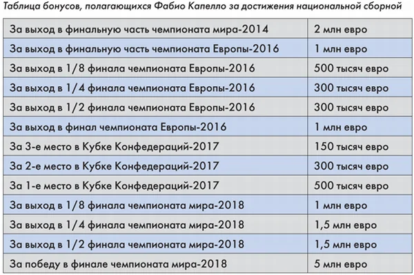 «Правда, в период подготовки и игр сборной на чемпионате мира в Бразилии (с 24 января по 25 июля 2014 года) Капелло было выплачено 4,5 млн евро. Кроме того, в соглашении говорится и о бонусах, которые главный тренер уже получил или получит в случае успешного выступления сборной на будущих международных соревнованиях», — пишет издание.