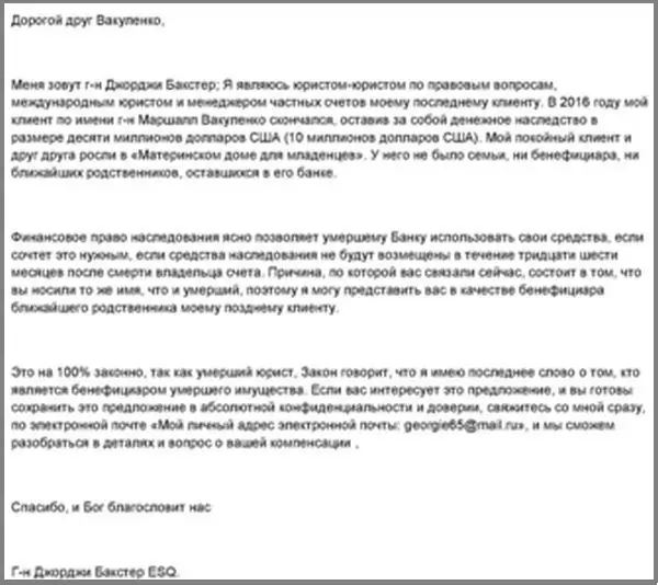 Соответствующее письмо музыканту пришло от юриста по международным и правовым вопросам Джорджи Бакстера. Он написал Василию Вакуленко, что недавно скончался его клиент Маршалл Факуленко и оставил рэперу со схожей фамилией наследство в $ 10 млн.