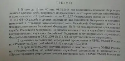 Итак, для начала всем сотрудникам ростовской полиции в срок до 16:00 8 февраля их руководители должны были рассказать об указанных выше уголовных делах в отношении их коллег, а затем зачитать выдержки из законов «О службе в органах внутренних дел РФ», «О противодействии коррупции», «О государственной гражданской службе РФ» и «Типового кодекса этики госслужащего».