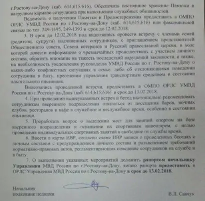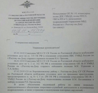 Один из самых крупных полицейских правозащитных пабликов в социальной сети «ВКонтакте» опубликовал скан приказа начальникам всех подразделений УМВД Ростова, под которым стоит подпись «полковник полиции В.Л.Савчук». Документ состоит из двух частей. В первой, видимо в качестве констатации наличия проблемы, сообщается об уголовных делах, возбуждённых в отношении сотрудников ростовской полиции в период с 5 по 7 февраля. Здесь фигурируют должности старшего сержанта, двух старших лейтенантов, майора и даже подполковника полиции. Что касается вменяемых им статей, то это: оскорбление сотрудника власти, разбой и получение взятки.