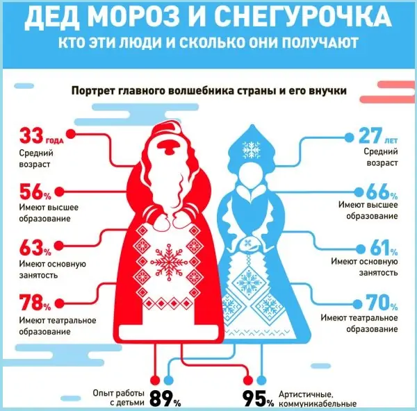 Высшее образование есть у 56% Дедов Морозов и 75% Снегурочек. При этом 63% Дедов имеют постоянную работу, а 37% — безработные и предновогодние корпоративы для них — способ заработать. Три из пяти Снегурочек имеют постоянное место работы.