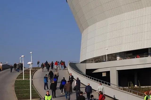 16:05. Попытаемся добраться до стадиона на одном из шаттлов. Изначально планировалось, что их будет 60, но потом оказалось, что всего 45. Кстати, ехать обратно придётся на них же. Автобусы курсируют до 23:30.
