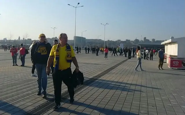 17:08. На площади перед стадионом уже многолюдно. Много разных желто-синих людей, все как надо.