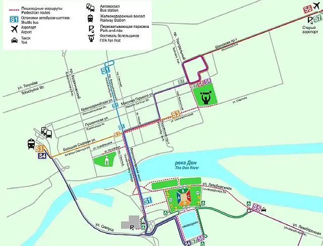 А вот саму «Ростов-Арену» и зону Фестиваля болельщиков свяжет маршрут S8. Схема движения: Максима Горького — Ченцова — Каяни — Шолохова — Театральный — Максима Горького — Кировский — Большая Садовая — Ворошиловский — Ворошиловский мост — Южный подъезд к Ростову — южный подъезд к стадиону — водноспортивный объект «Акватория».