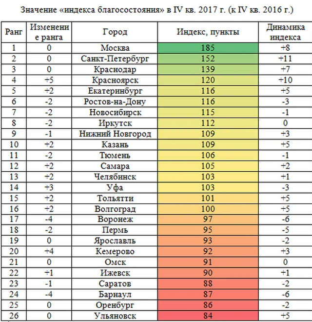 В целом стоимость жизни выросла в 14 городах и снизилась в 10. Сильнее всего индекс упал в Барнауле (-6), Воронеже (-6) и Перми (-5), а максимальный рост отмечен в Санкт-Петербурге (+11) и Красноярске (+10). Рейтинг дорогих городов, как и годом ранее, возглавили Москва, Санкт-Петербург и Краснодар, а самые дешевые города — Ульяновск и Оренбург.