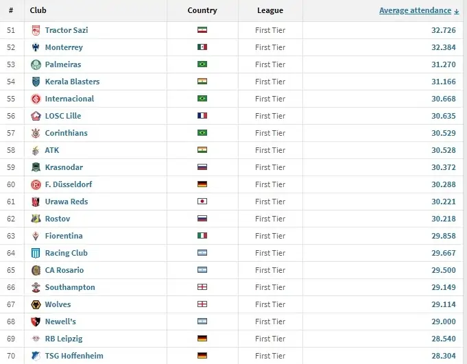 Список возглавляют дортмундская «Боруссия» (76,9 тысяч зрителей), мюнхенская «Бавария» (74 тысячи) и «Манчестер Юнайтед» (71,1 тысяча).