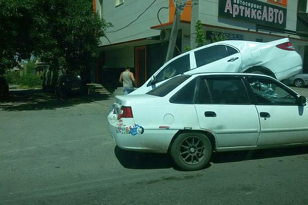 Любопытные фото появились после полудня в субботу, 16 июля, в сообществе «Ростов-на-Дону | Главный». На снимках, сделанных на улице Нансена, одна иномарка взгромоздилась на другую. У той, что снизу, отлетел бампер и пробито лобовое стекло. Причём стекло повреждено задним колесом той иномарки, что сверху.