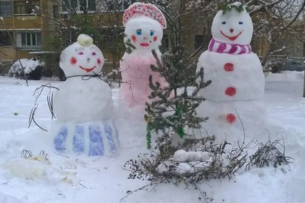 К примеру, один из дворов Болгарстроя украсила весёлая и яркая семейка снеговиков. Автор скульптур продумал наряды и образы своих героев до мелочей.