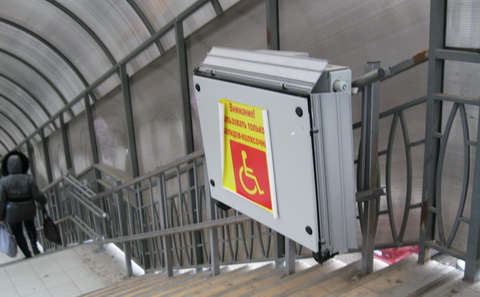 Выполненный по современным технологиям переход с практической точки зрения имеет ряд недостатков, и в первую очередь, конечно, для людей немощных и пожилых. Несмотря на то, что нормы строителями формально соблюдены (есть металлические полозья и некое приспособление для поднятия колясок), практическую помощь инвалиду оказать некому: он находится внизу, а агрегат наверху.