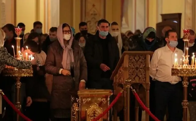 В этом году из-за коронавирусных ограничений был отменён Крёстный ход по Соборной площади, а всех прихожан обязали соблюдать социальную дистанцию и масочной режим. Правда, судя по фотографиям, о соблюдение дистанции в храме речи не шло.