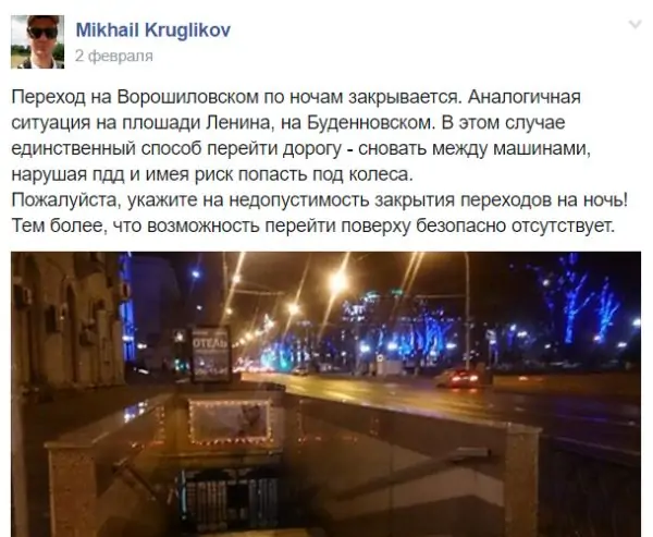 Ростовчанин Михаил Кругликов пытается добиться того, чтобы подземные переходы в городе не запирались в ночное время. Своё обращение он опубликовал в сообществе «Мой адрес — Ростов-на-Дону», созданном городской администрацией для общения с ростовчанами и в поддержку одноимённой телепрограммы.