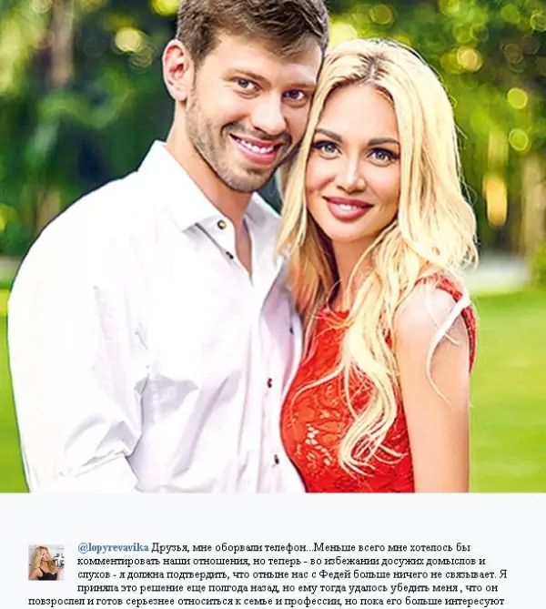 «Меньше всего мне хотелось бы комментировать наши отношения, но теперь — во избежание досужих домыслов и слухов — я должна подтвердить, что отныне нас с Федей больше ничего не связывает. Я приняла это решение ещё полгода назад, но ему тогда удалось убедить меня, что он повзрослел и готов серьезнее относиться к семье и профессии, но пока его больше интересуют социальные сети и красивые машины. Он хороший парень, но, увы, нам больше не по пути. Я от всей души желаю ему здоровья и реализации всех его карьерных планов», — написала в соцсети Виктория Лопырёва.